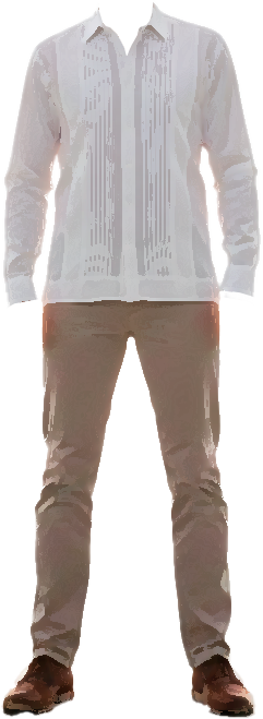 Guayabera blanca, Pantalón beige, zapatos café o tennis blancos